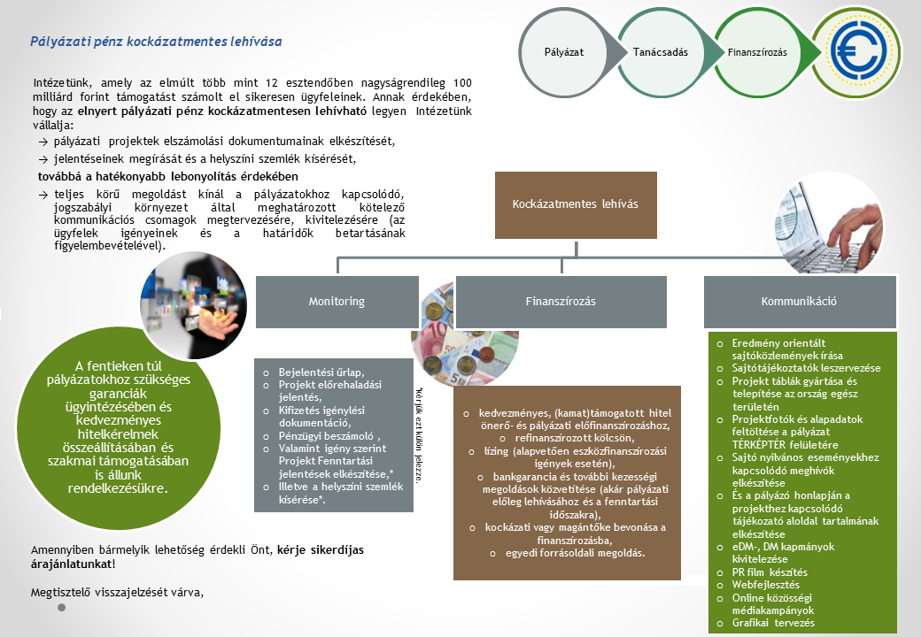 Pályázatírással, pályázati tanácsadással és projektmenedzsmenttel kapcsolatos szolgáltatásainkat jellemzően fix díj nélküli, sikerdíjas konstrukcióban nyújtjuk.